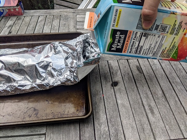 8. Using last open side of the aluminum foil pocket, pour in 1 cup of fruit juice.