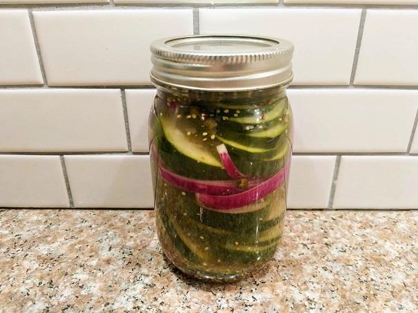 4. Pour boiling water-vinegar-salt mixture into mason jar