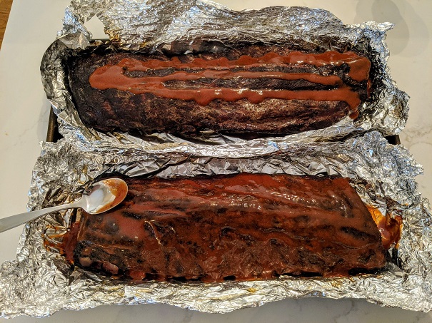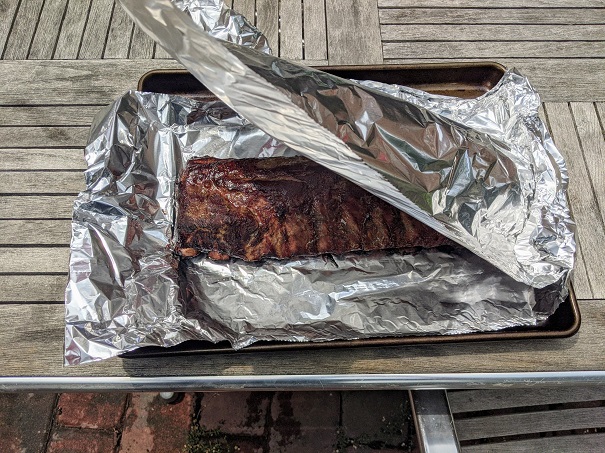 10. After steaming for 2 hours, remove ribs from smoker. Carefully open one