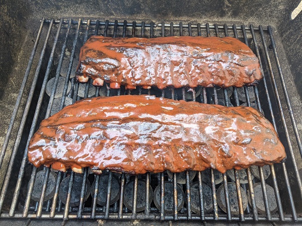 11. Once the ribs have been covered in barbeque sauce, place ribs back on smoker or grill.